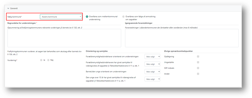 Du skal markere ’Overføres som mellemkommunal underretning’, derved fremkommer der felter på siden, som skal udfyldes i forbindelse med underretningen og sagsoverførslen.