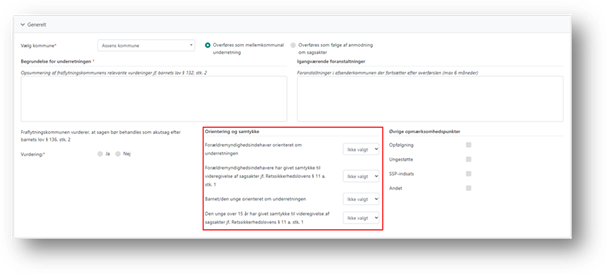 Du skal oplyse om orientering og samtykke fra forældremyndighedsindehaver og barnet/den unge. Det gør du ved at klikke i de enkelte felter og vælger Ja eller Nej.