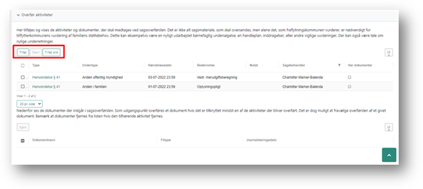 Her kan du tilføje de aktiviteter, du vurderer, er relevante for sagen at overføre til ny bopælskommune. Det er ikke alt sagsmateriale, som skal medsendes, men alene det, som fraflytningskommunen vurderer, er nødvendigt for tilflytningskommunens vurdering af familiens støttebehov.
