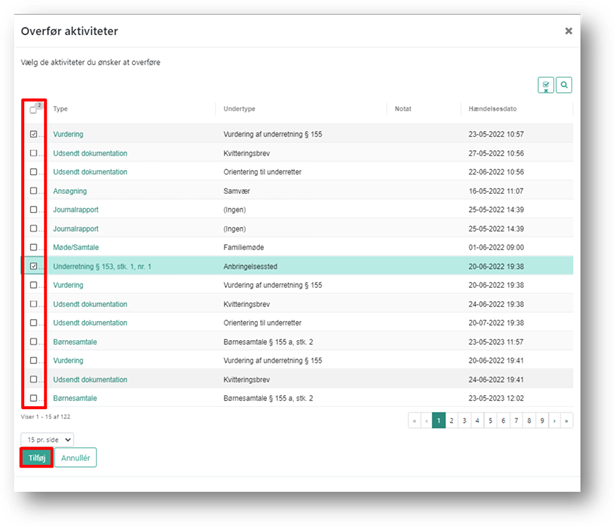 Hvis det er relevant at oversende mange aktiviteter, kan du med fordel ændre hvor mange aktiviteter, der vises pr. side og dernæst tilvælge alle aktiviteter på siden ved markering af den øverste boks. Herefter vil du kunne fravælge enkelte aktiviteter ved at fjerne markeringen fra disse. Du har også mulighed for at forsætte til næste side og tilføje yderligere aktiviteter.