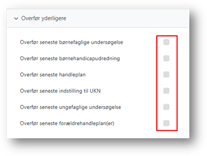 Fanen er kun synlig, såfremt der er yderligere data på sagen, der kan overføres. Du har her mulighed for at vælge, om du vil overføre senest afsluttede børnefaglig undersøgelse, handleplan, forældrehandleplan(er), børnehandicapudredning, Indstilling til UKN og ungefaglig undersøgelse. Hvis du vælger en af disse, er det selve indtastningsmodulet der overføres, hvilket betyder at den nye kommune fx kan genbruge fra seneste børnefaglig undersøgelse.