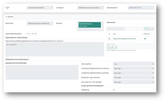 På sagen er aktiviteten ’Udsendt dokumentation’ – ’Mellemkommunal underretning’ blevet oprettet og du kan se hvilke oplysninger som I har oversendt til ny kommune. Feltet ’Personer’ indeholder oplysninger om Modtagerkommune.