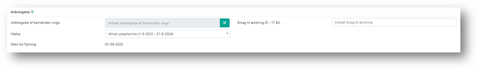 Når du har valgt eller oprettet en anbringelsesydelse, udfyldes feltet ’Dato for flytning’ automatisk med ydelsens startdato, det er derfor vigtigt, at startdatoen er den dato, hvor barnet/den unge flytter til det nye sted. Denne dato indberettes til anbringelsesstatistikken. Desuden indberettes tilbudstypen og beliggenhedskommune fra den valgte ydelse også, samt eventuelt oplysninger om leverandøren.