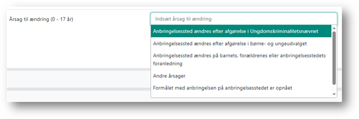Barnets/den unges alder har en betydning for, hvilke oplysninger der skal indberettes til anbringelsesstatistikken. Hvis barnet/den unge er under 18 år på den tilknyttede ydelses startdato, vises specialfeltet ”Årsag til ændring (0-17 år)” som også skal udfyldes inden aktiviteten udføres. Her skal du angive årsagen til at anbringelsen ændres. Dette gøres ved at vælge fra rullemenuen. Er der mere end en årsag til, at barnet/den unges anbringelsessted ændres, skal der vælges flere årsager, enten ved at vælge disse enkeltvis i rullemenuen, eller ved at holde CTRL nede, og klikke. Er den unge over 18 år på ydelsens startdato, skal ændringsårsagen ikke indberettes.