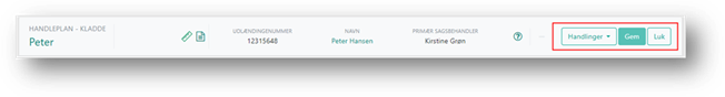 I højre side af topmenuen finder du en række handlingsknapper. Hvis du vil gemme planen i sin nuværende form, skal du trykke på ”Gem”. Hvis du vil lukke planen for at komme tilbage til sagen, skal du trykke på ”Luk”.