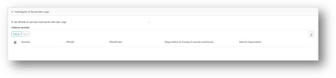 Du vælger blandt inddragelser/børnesamtalerne ved at sætte flueben i venstre side af tabellen, ud for den/de aktiviteter, som du vil tilføje og klikker på knappen Tilknyt inddragelse(r) af barnet/den unge. Det er muligt at tilknytte mere end én inddragelse eller børnesamtale.