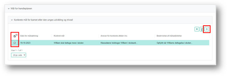 Hvis du har brug for at fjerne en eller flere børnesamtaler eller inddragelser fra handleplanen, skal du markere dem ved at sætte flueben i venstre side af listen på handleplanen og klikke på knappen Fjern.