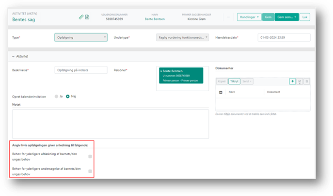 Når du har afholdt opfølgningen, skal du på opfølgningsaktiviteten journalisere den faglige vurdering, samt angive hvis den løbende opfølgning har givet anledning til behov for yderligere afdækning eller undersøgelse. Læse mere om dette i afsnittet om Opret afdækning fra aktivitet.