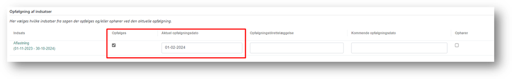 Du skal markere den eller de indsatser, som du er ved at følge op på samt angive den aktuelle opfølgningsdato.