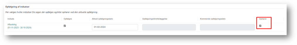indsatsen ophører efter denne opfølgning, skal du markere ’Ophører’. Når du gør