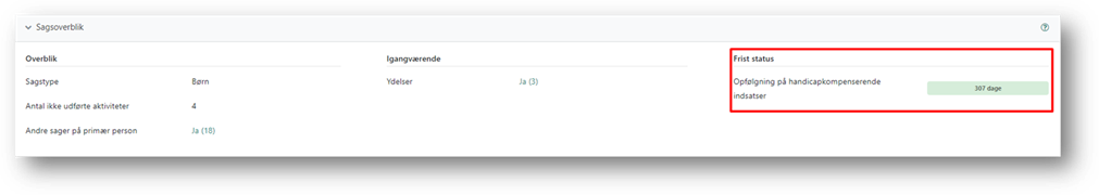 Fristen opdateres hver gang en opfølgningsaktivitet udføres eller hvis der sker ændringer til ’Kommende opfølgningsdato’ på ydelsen med førstkommende frist. Fristen forsvinder helt, når alle indsatser er markeret som ophørt og opfølgningsaktiviteten er udført.
