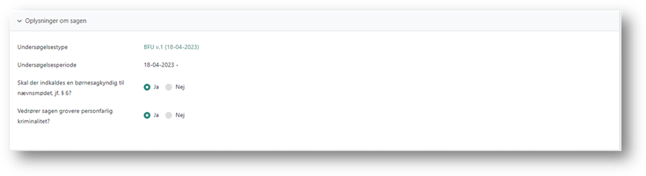 Fanen ’Oplysninger om sagen’ vil fremgå, hvis der forud for juni 2023 er taget stilling til, om der skal indkaldes en børnesagkyndig til mødet, eller taget stilling til hvorvidt sagen vedrører grovere personfarlig kriminalitet.