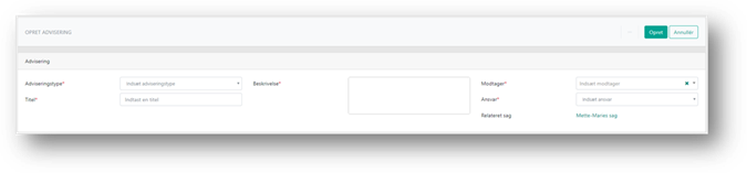 Klikker du på Annullér, bliver du ført tilbage til sagen, uden der bliver oprettet en advisering. Er der ikke andre adviseringer på sagen, fjernes fanen næste gang du åbner eller genindlæser sagen.