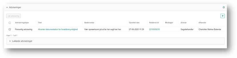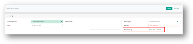 Du kan se hvilken sag adviseringen er oprettet fra, i feltet Relateret sag. Dette fungerer også som et link til sagen.