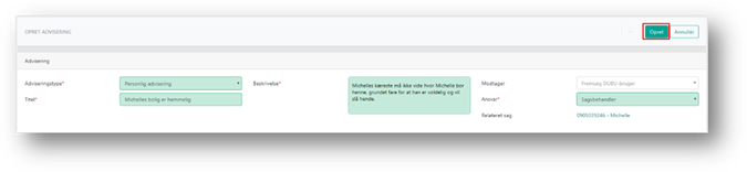 Du færdiggør oprettelsen af adviseringen ved at klikke på knappen Opret. Herefter fører systemet dig tilbage til sagen.