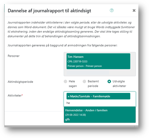 Du starter med at danne en journalrapport, som efterfølgende skal indgå i den samlede aktindsigt til borgeren. Den samlede aktindsigt vil dermed indeholde både journalen (aktiviteterne) og dokumenterne på sagen.