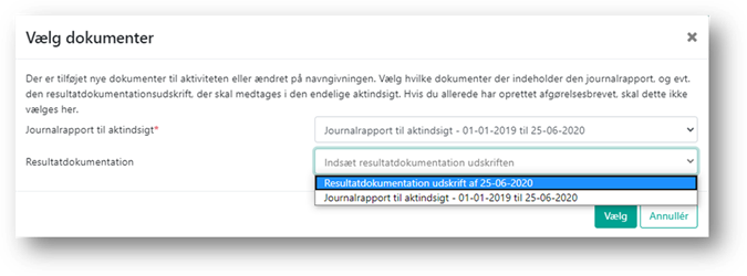 Klikker du på Dan aktindsigtsrapport åbnes en boks, hvor du skal vælge, hvilke dokumenter på aktiviteten der er henholdsvis journalrapport og resultatdokumentation. Såfremt du har en version af journalrapporten, hvor der er ekstraheret, kan du her vælge den.