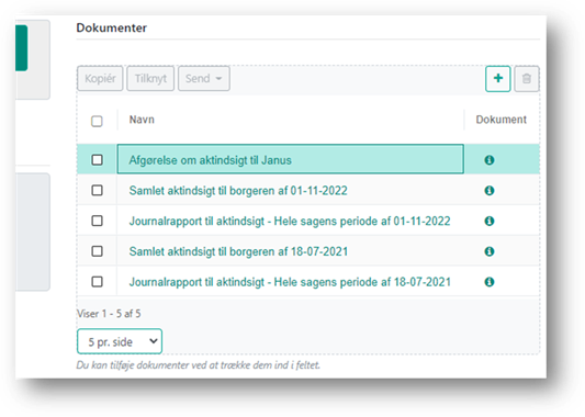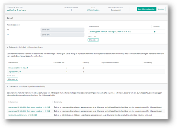 Når du klikker på ’Dan dokumentsamling’ dannes aktindsigtsrapporten og du vender tilbage til aktiviteten, hvorfra du kan sende den til borgeren som beskrevet i afsnittet Send dokument fra aktiviteten.