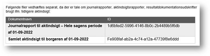 Hvis du har valgt at aktindsigtsperioden er hele sagen eller en bestemt periode, vil der udover aktindsigtsrapporten, blive dannet en udskrift af resultatdokumentation, hvis der er udfyldt resultatdokumentation på sagen. Hvis du har valgt udvalgte aktiviteter, vil der ikke blive dannet en udskrift af en eventuel resultatdokumentation. Resultatdokumentationen vil du skulle udskrive særskilt ved at gå ind på resultatdokumentationen og anvende vis udskrift, hvis den også skal udleveres.