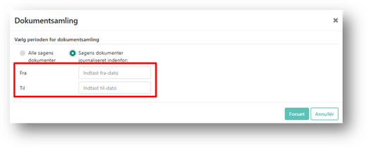 Som standard er alle sagens dokumenter valgt. Du kan vælge en bestemt periode ved at klikke i feltet ’Sagens dokumenter journaliseret indenfor:’, hvorefter det bliver muligt at indtaste fra- og til-dato.