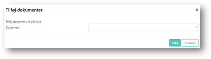 Klikker du på knappen ’Tilføj’ åbner DUBU en boks, hvor du kan søge efter og vælge andre dokumenter på sagen. Klik på ’Tilføj’ og dokumentet vil fremgå af listen.