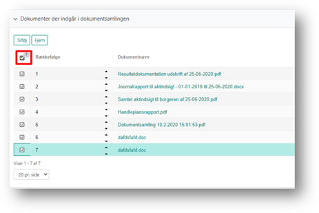 Du kan også vælge at markere alle dokumenter ved at sætte markering i den øverste firkant. Dette kan anvendes, hvis mange af dokumenterne skal fjernes fra dokumentsamlingen. Efter at have markeret alle dokumenter, kan du fjerne markeringen for de dokumenter, som du ønsker at beholde i dokumentsamlingen og dernæst fjerne de resterende dokumenter.
