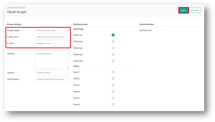Når du opretter en bruger, skal du også tilknytte brugeren til en afdeling og eventuelt til et team, afhængig af kommunen valgte organisering. Bemærk at det er obligatorisk at tilknytte en bruger til en afdeling, mens det er valgfrit om brugeren tilknyttes et team. Under området Medlemskaber kan du se den/de afdelinger og teams der er oprettet i din kommune.