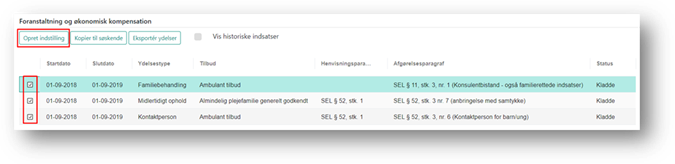 Bemærk, at det kun er de ydelser på foranstaltningerne der er i tilstand ’Kladde’, der bliver medtaget i indstillingen. Eventuelle godkendte ydelser vil fremgå af indstillingsrapporten som reference.