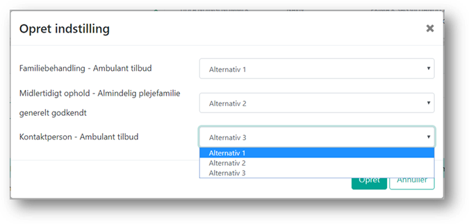 Når du trykker på knappen ’Opret indstilling’ åbnes en boks. Her får du mulighed for at gruppere foranstaltningerne eller den økonomiske kompensation i indstillingsalternativer.