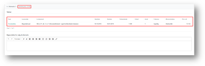 hvilke ydelser der indgår i alternativet og hvad alternativets samlede pris