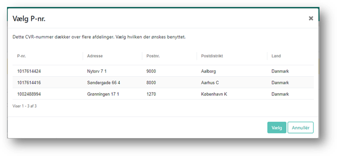 Hvis der kun findes ét p-nummer under det valgte CVR-nr., udfyldes de oplysninger, der kan trækkes fra registeret med det samme. Er der imidlertid flere p-numre, skal du vælge, hvilket P-nummer som er korrekt for den leverandør, du er ved at oprette.