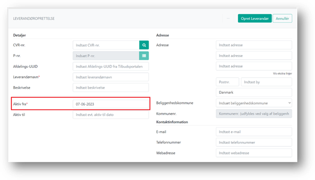 Du skal endvidere angive en ’Aktiv fra’ dato på leverandøren. Det vil sige, hvornår leverandøren skal kunne vælges på ydelser og kunne tilknyttes Tilbudte ydelser i ydelseskataloget.