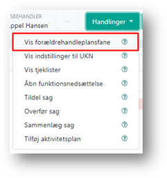 Når du første gang skal oprette en forældrehandleplan på en sag, skal du starte med at hente fanen frem. Det gør du ved at klikke på ’Handlinger’ i sagsmenuen og klikke på ’Vis forældrehandleplansfane.