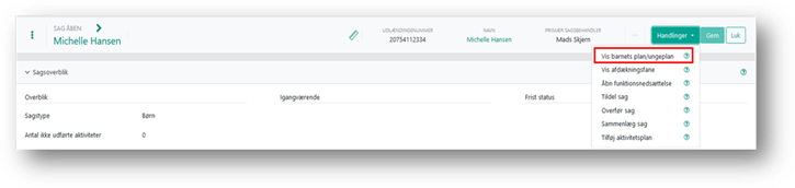 Når du første gang skal oprette en barnets plan eller en ungeplan på en sag, skal du starte med at hente fanen frem. Det gør du ved at klikke på Handlinger i Sagsmenuen og klikke på ”Vis barnets plan/ungeplan”. Hvis du skal oprette planen i forbindelse med en opfølgning, kan dette også gøre via aktiviteterne for opfølgning BL § 95 eller LBU.