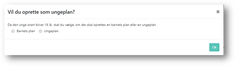 Når du klikker på ”Opret” åbnes der en barnets plan, hvis barnet/den unge er under 16 år eller en ungeplan, hvis den unge er over 16 år. Hvis der er under 3 måneder til, at den unge fylder 16 år, får du mulighed for at oprette en ungeplan med det samme.