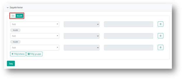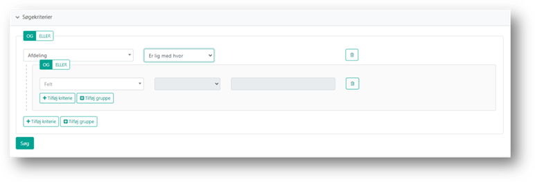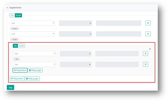 For mere komplicerede søgninger kan du med fordel oprette kriterierne i logisk sammenhængende grupper. Grupperne fungerer i sig selv som et søgekriterium, og evalueres på samme niveau som øvrige kriterier på samme niveau i søgningen.
