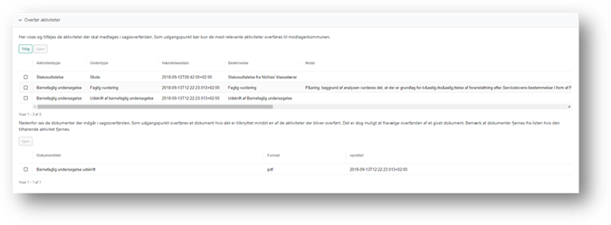 •En liste med de aktiviteter der er overført, hvor aktiviteternes type, undertype, hændelsesdato og beskrivelse fremgår.