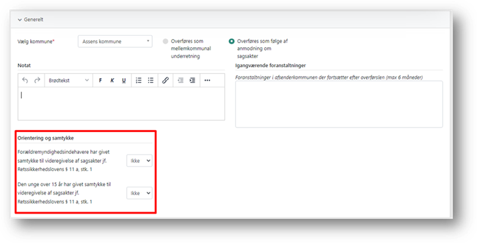 Herefter skal du markere ’Overføres som følge af anmodning om sagsakter’. Hvis Barnet/den unge er over 15 år, skal du angive, om den unge har givet samtykke til oversendelse af sagsakter. Hvis barnet/den unge er under 18 år, skal du angive om forældremyndighedsindehaveren har givet samtykke til videregivelse af sagsakter.