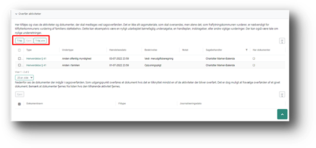 Her kan du tilføje de aktiviteter du vurderer, er relevante for sagen at overføre til ny bopælskommune. Det er ikke alt sagsmateriale, som skal medsendes, men alene det, som fraflytningskommunen vurderer, er nødvendigt for tilflytningskommunens vurdering af familiens støttebehov.