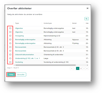 aktiviteter, der skal overføres ved at markere aktiviteterne i venstre side af