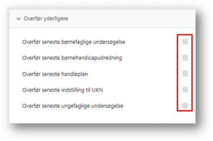 Fanen Overfør yderligere er kun synlig, såfremt der er yderligere data på sagen, der kan overføres. Du har her mulighed for at vælge, om du vil overføre senest afsluttede handleplan, børnefaglig undersøgelse, børnehandicapudredning, indstilling til UKN eller ungefaglig undersøgelse.
