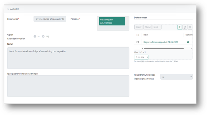 Systemet opretter aktiviteten ”Oversendelse af sagsakter” – ”Ny bopælskommune” og systemet fører dig til aktiviteten.