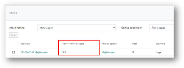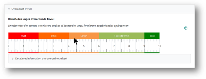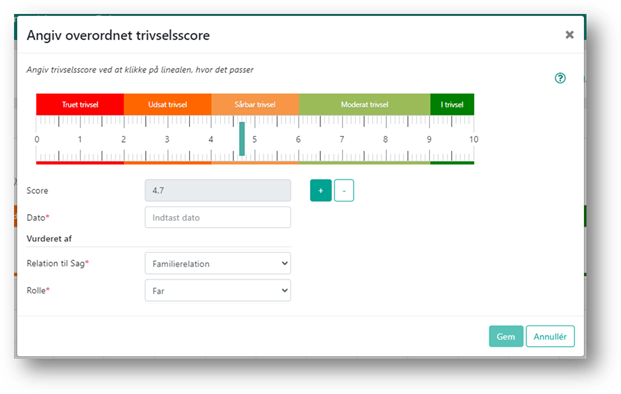 Under fanen Overordnet trivsel kan du registrere en samlet score for hvordan barnet har det, vurderet af barnet selv, forældrene, dig som sagsbehandler eller andre personer omkring barnet.