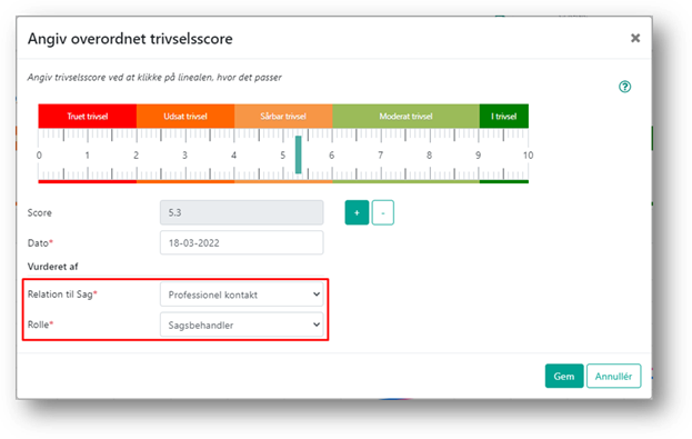 Når du skal angive din egen score, som sagsbehandler, skal du vælge relationen ’Professionel kontakt’ og rollen ’Sagsbehandler’. Det vil være denne score, som bliver vist på sagsoverblikket og som også kan vises som kolonnen på sagslisten.