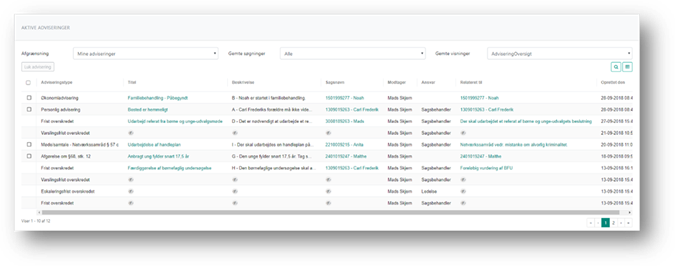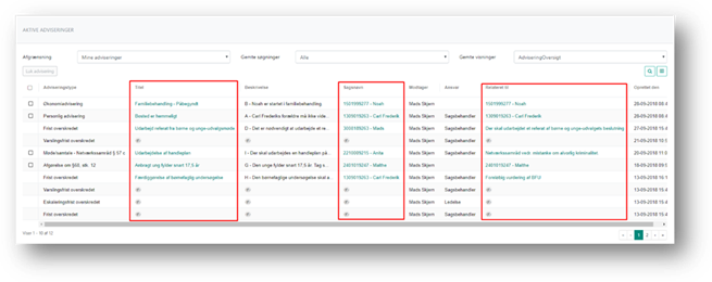 Du kan fra fanen Aktive adviseringer åbne adviseringerne, den tilhørende sag og den aktivitet eller undersøgelse adviseringen er relateret til. Det kan du gennem links i kolonnerne Titel, Sagsnavn og Relateret til.