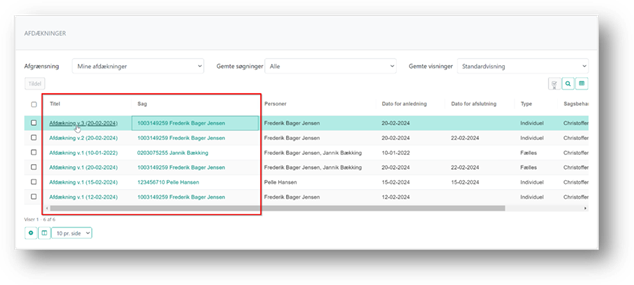 Fra oversigten for ”Afdækninger” kan du åbne den enkelte afdækning, ved klik på linket i kolonnen ”Titel”, eller åbne sagen ved at klikke på sagsnavnet