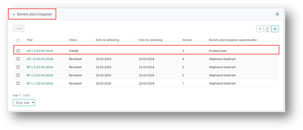 Når der på en sag er en barnets plan og/eller en ungeplan, kan du se fanen ’Barnets plan/Ungeplan’ på sagen. På fanen finder du en oversigt over de planer, som er på sagen. Der vil være flere på listen, hvis der har været revideringer.