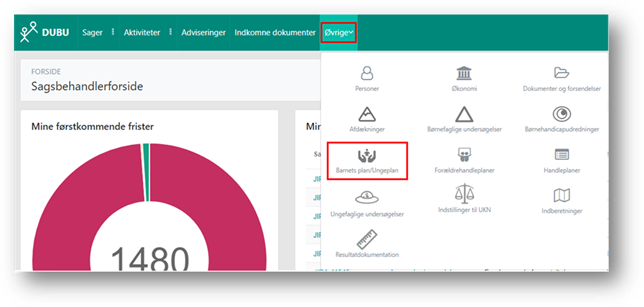 Hvis du vil se et overblik over planer på tværs af sager, kan du bruge barnets plan/ungeplan oversigten, som du finder under Øvrige øverst i DUBU, og derefter klikke på Barnets plan/Ungeplan.