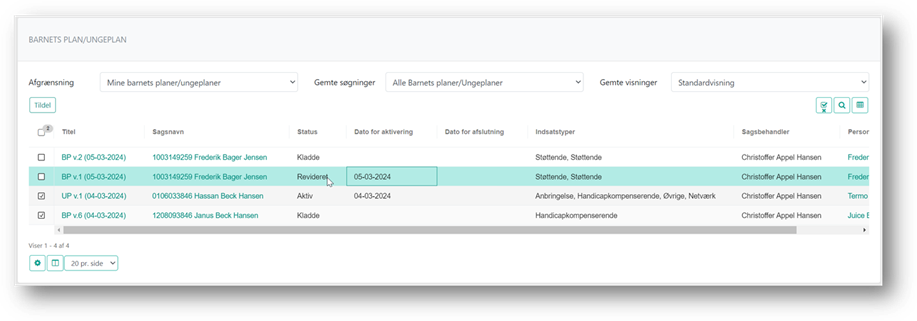 Som sagsbehandler kan du f.eks. filtrere og sortere på listen, for at se hvilke planer, der er aktive, under udarbejdelse eller lignende.