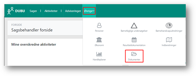 Du kommer ind på oversigten for dokumenter på tværs af sager gennem navigationsbjælken. Du skal først klikke på Øvrige og derefter på Dokumenter.